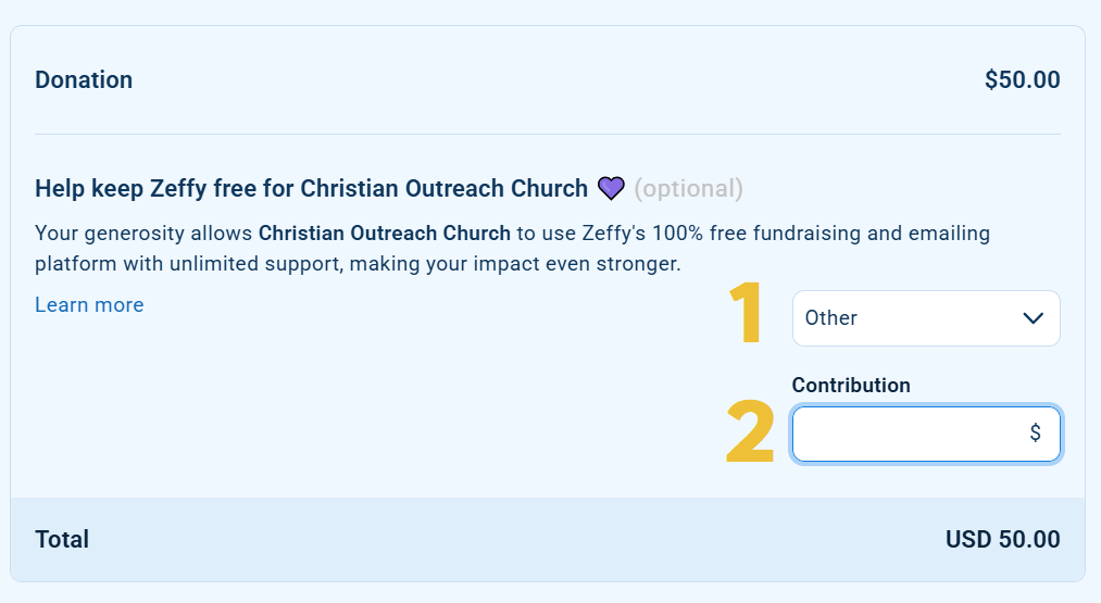 If you do not wish to tip Zeffy 17%, in the second step, select “Other” and enter a different amount (including $0) .